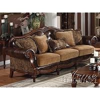 This sofa has traditional elegance. Its fabric and "bonded leather" show very well. The piece is quite long and deep....which is great for taller people. The sofa's legs are very strong and attractive. The ensemble blends very well with my decor. Good price! I love it!Want Acme 05495 Dreena Bonded Leather Sofa with Five Pillows Discount?