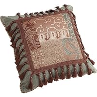 I bought this to accompany all of the other Croscill Galleria components...pillows, Euro shams, valances, sheets, and 4-piece comforter set. It's all pretty spectacular when combined and it's not too feminine. I try to stay as gender neutral as possible because the guy in my life likes cute moose and bear motifs. (Me? Not so much!) Anyway, the whole ensemble is very plush and welcoming and this pillow is a wonderful part of it. I was surprised to see some glitz, though, (not unhappy, just surprised) because each tassel has a brown, faceted, light-catching bead threaded onto it up to the braiding. The sewn-on square of fabric is a little too shy of the aqua/dusty teal accent color for my taste, but I understand that the square that ended up on my pillow is just my 'luck of the draw' from the cutting table (sigh!). However, the pillow is very well made, has a nice fill and is true to the 18"x18" stated size. The aqua/dusty teal color is actually much less washed-out than my monitor's depiction of it and I'm absolutely fine with that. The remaining colors are a nice combination of chocolate milk, vanilla, dk. cinnamon, dk. chocolate, and creamy-taupe. Yummy! It really is beautiful! I'm quite pleased with my purchase and we love our new bedroom.