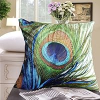 Elegant Decorative Throw Pillow Cover - Peacock Feathers Design on Both Sides - Soft Velvet Fabric -