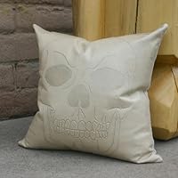This pillow is pretty much like it looks in the picture--the only thing slightly different is the color--it's definitely more of a yellowish beige shade--not really so pretty. The skull pattern itself is hard to see unless the light is shining just right on it. Think it's a little more expensive than it looks, but I kept it.