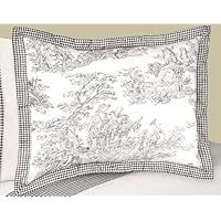 The sham seems to have been made from very different strengths of black dye: while the checked border is dark black, the toile design of the central piece is faded to grey. It is fine if you want the look of something made from antique textile scraps, but did not work with the new black toile accessories I paired it with on the bed.