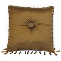 The color in the photo for this pillow is about right. It is not the bright shiny gold as it appears in the bedding collection photo. This photo makes the pillow look like something cheap you'd buy at Pier 1, but it really doesn't look that way. See the picture I uploaded to get a better idea. It is a sturdy firm pillow made in the U.S. and the fabric seems like it will hold up and not get shredded immediately. The pillow filling is labeled 95% feather and 5% down. The roped center of the pillow looks flat in the picture but is actually three dimensional like a cone. The back doesn't have that embellishment. The size is not 18x18" either. Corner to corner it is 17", but the sides are slightly curved so that the inner dimensions are more like 14x14".
